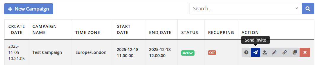 Find the campaign for which you want to send invites and click on the Send Invite (Paper Plane Icon) button in front of it.