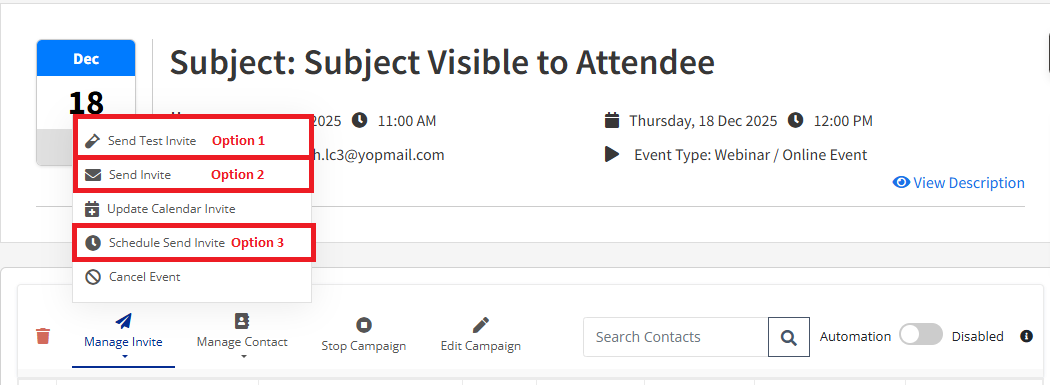 Once you’ve uploaded or added your attendees using the Upload Attendee option, follow the steps below to send calendar invites.