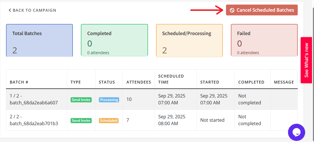 The Cancel Scheduled Batches feature allows you to stop any pending or processing batches when you have initiated send, update, or cancel invites using the Send in Batches option.