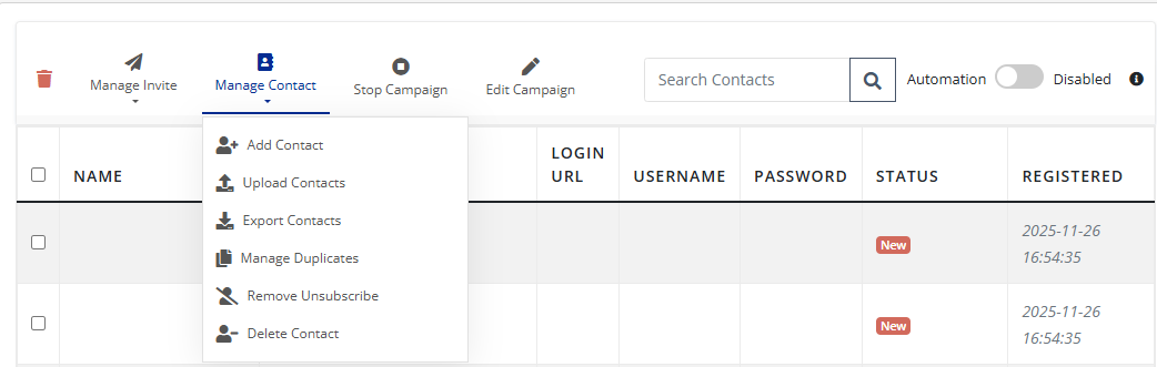 Navigate to the Manage Contacts section in your Send Invite Page of the Campaign.